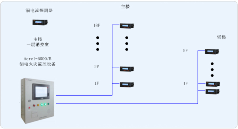 針對本項目的性質及配電結構,現針對其主樓(18層)、輔樓(5層),兩棟樓設計一套電氣火災監控系統。在主樓和輔樓的樓層配電箱的進線端安裝漏電流探測器,由此來實時監測變電所內重要回路的漏電流,以確保變電所配電系統的電氣安全。