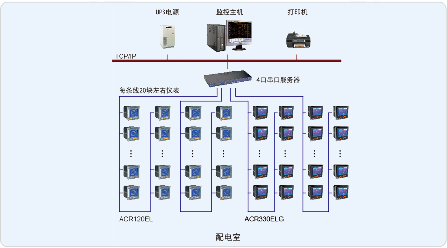 整個系統(tǒng)采用網(wǎng)絡(luò)分布式結(jié)構(gòu),監(jiān)控主機(jī)位于地下一層變電所值班室內(nèi),配電柜內(nèi)安裝有本公司ACR330ELH、ACR120EL儀表共計(jì)60多回路。仁恒河濱花園電力監(jiān)控系統(tǒng)現(xiàn)場共1個低壓配電室,配電室內(nèi)采用安科瑞ACR系列電力監(jiān)控儀表采集各回路的電流、電壓、電能等電參量,然后通過中間層采集設(shè)備網(wǎng)線到監(jiān)控室計(jì)算機(jī)上,實(shí)現(xiàn)遙測、遙信功能。