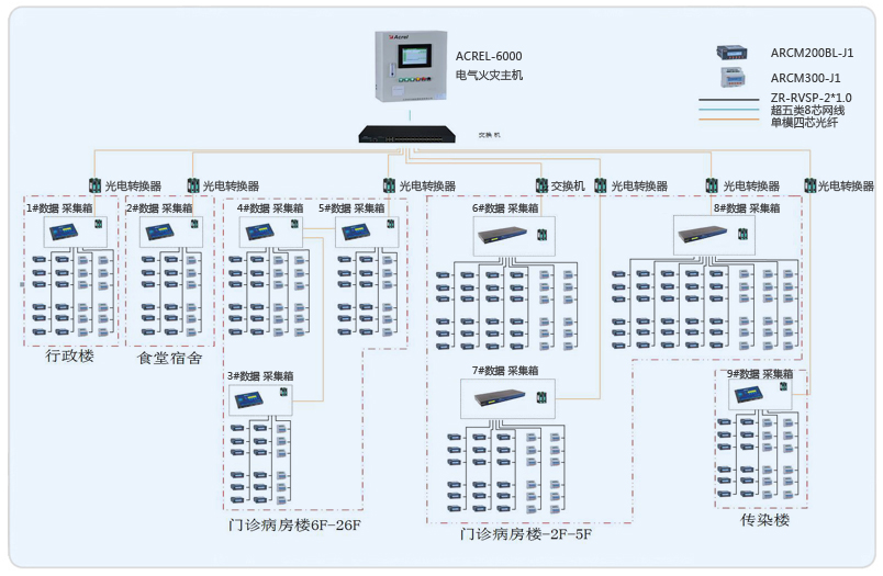 系統(tǒng)采用Acrel-6000電氣火災(zāi)監(jiān)控系統(tǒng),整個(gè)系統(tǒng)采用網(wǎng)絡(luò)分布式結(jié)構(gòu),監(jiān)控主機(jī)位于消控中心值班室門診一層,其余9個(gè)數(shù)據(jù)采集箱分布在行政樓、門診病房樓、食堂宿舍樓、感染樓,現(xiàn)場(chǎng)采用安科瑞ACRM系列漏電火災(zāi)儀表。所有監(jiān)控設(shè)備均通過屏蔽雙絞線至各自數(shù)據(jù)采集箱的通訊管理機(jī),再通過光電轉(zhuǎn)換器經(jīng)過光纖將數(shù)據(jù)傳輸至消控中心值班室門診一層,從而實(shí)現(xiàn)遠(yuǎn)程監(jiān)控。